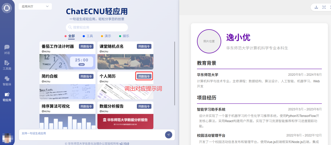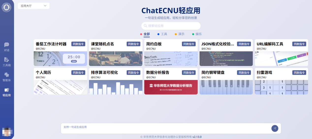ChateECNU平台充分考虑大家的实际使用需求,为了让使用更轻便灵活,特意打造了【轻应用】板块——应用大厅里直接备好10个实用工具,工具、演示、娱乐全涵盖,不用复杂操作,随用随取超方便~