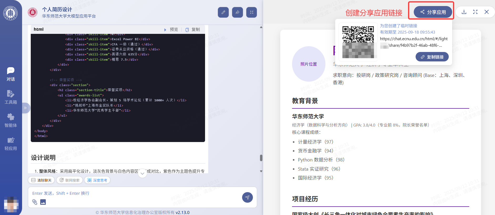 ChatECNU的轻应用还支持在线分享!生成临时访问链接和二维码。