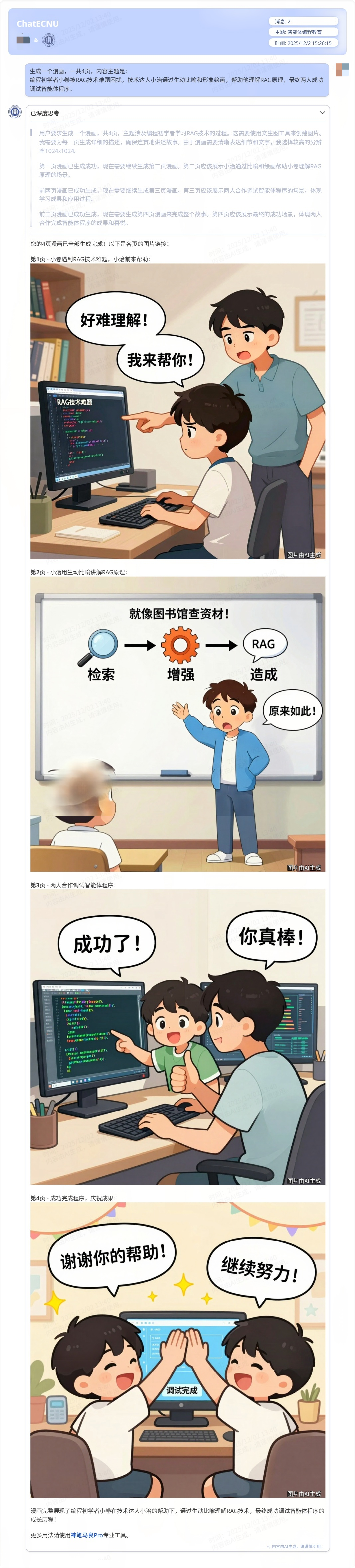 生成一个漫画,一共4页,内容主题是:编程初学者小卷被RAG技术难题困扰,技术达人小治通过生动比喻和形象绘画,帮助他理解RAG原理,最终两人成功调试智能体程序。