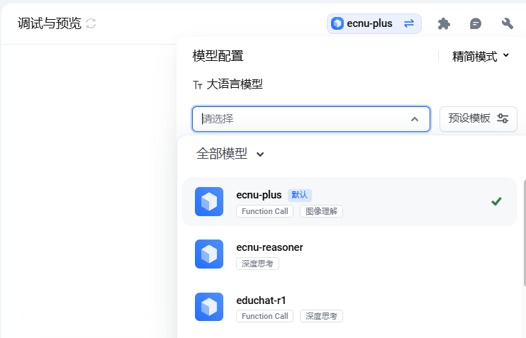 选择大语言模型:进入智能体编排页面,在右侧的调试与预览区域,有一个模型选择框。这里面有好多不同的大语言模型可供选择,不同的模型有不同的特点和擅长的领域。对于新手来说,ecnu-plus是个不错的选择,它在很多常见任务上表现都很稳定。选好模型后,先保持默认参数设置,这些参数就像是模型的“小脾气”设置,等你以后熟悉了再根据实际情况调整。