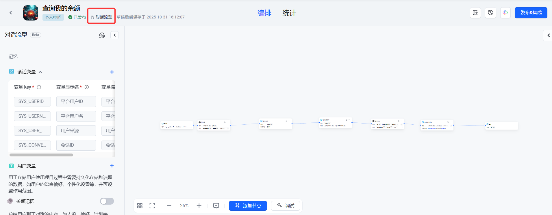- 输入参数选择:引用-》会话变量/SYS_USERNAME