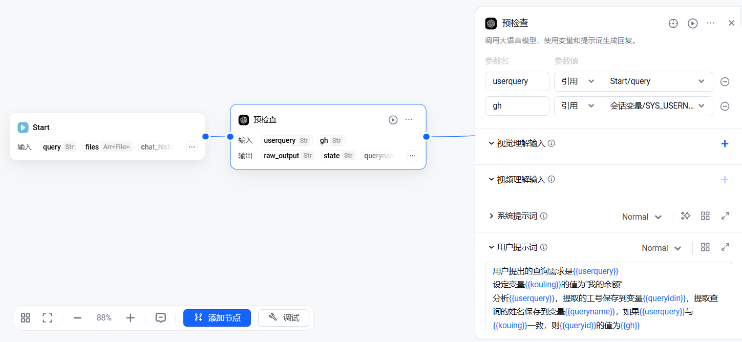 工作流中增加大模型节点,命名为【预检查】