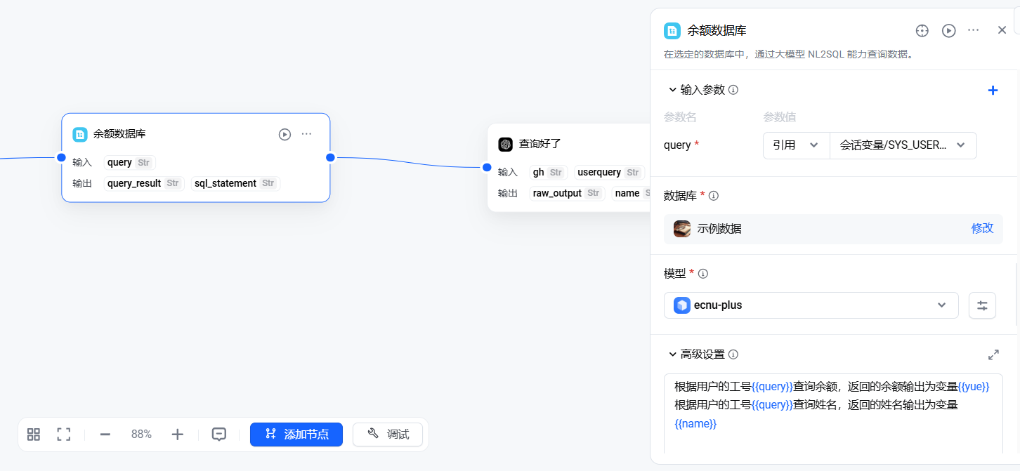 - 工作流中增加数据库节点,命名为【余额数据库】
