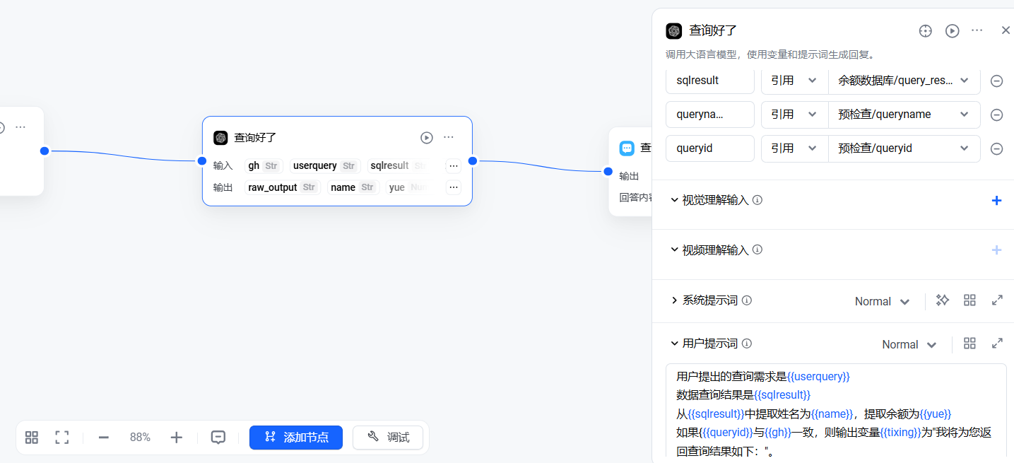 - 工作流中增加大模型节点,命名为【查询好了】