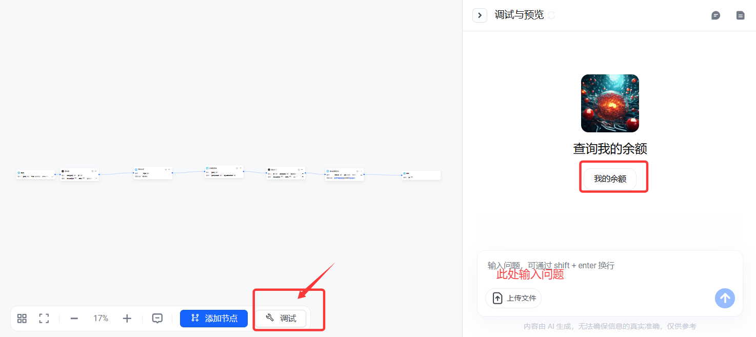 点击左下角“调试”,输出进行测试,如有问题进行修改,直至调试符合预期。