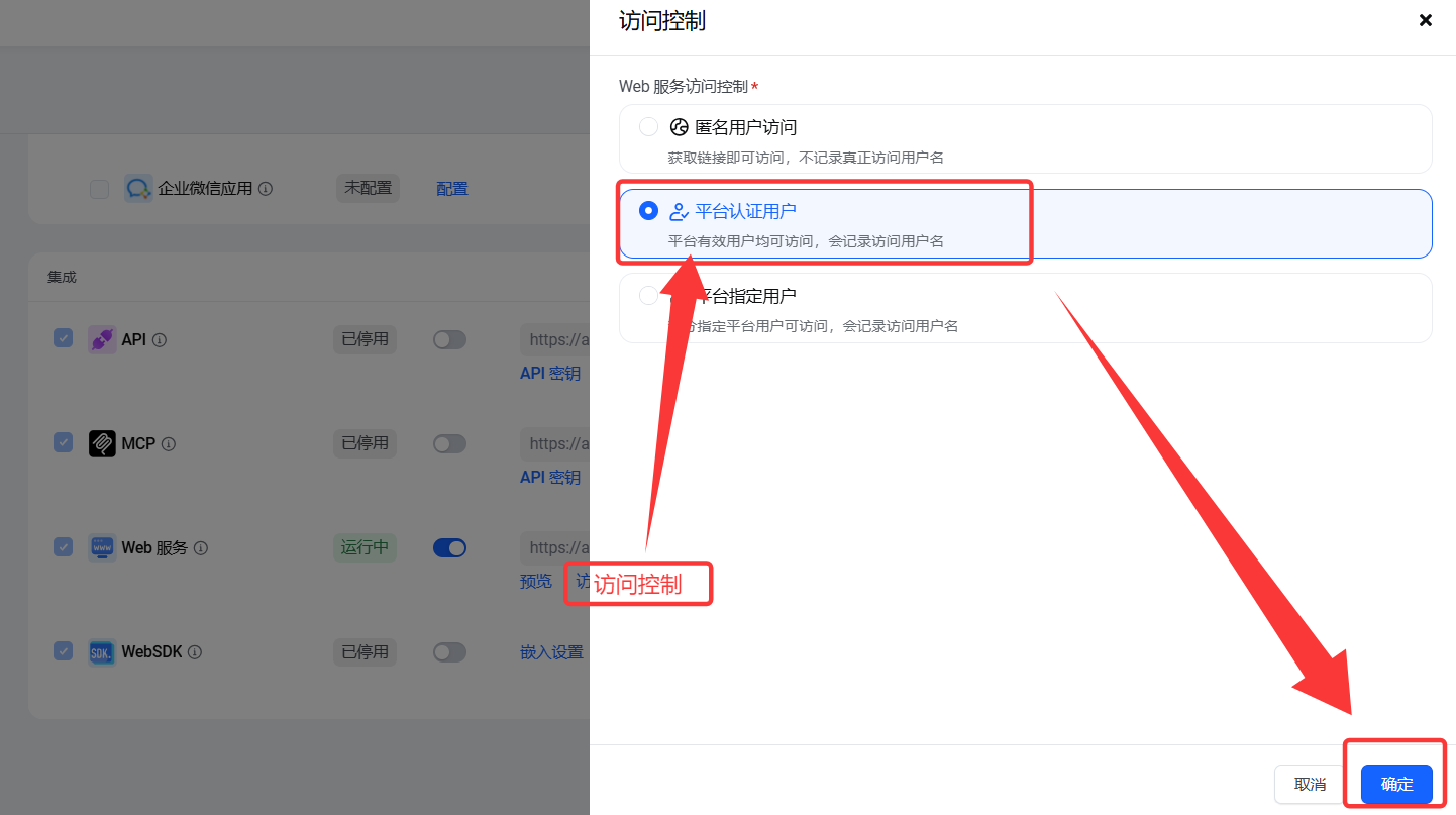 - 往下找到“集成”模块,在Web服务一行,点击右侧的“访问控制”,选择“平台认证用户”,确定后点击右上角“发布”按钮
