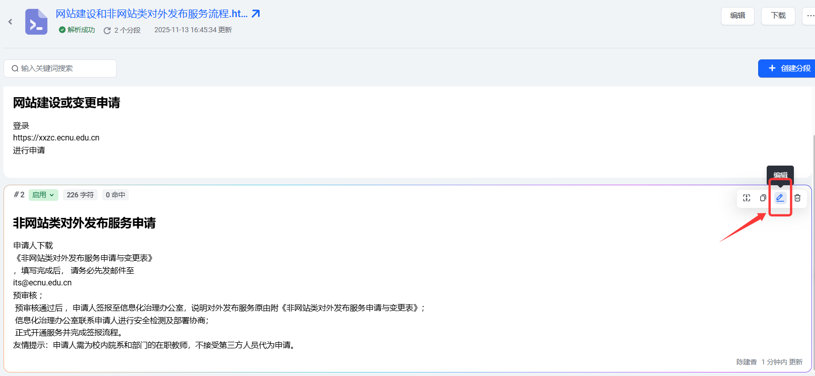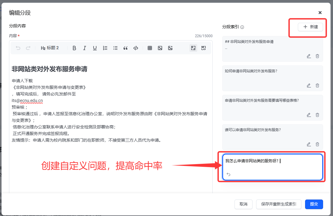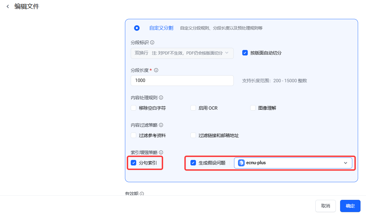 打开“编辑分段”窗口,查看后侧的“分段索引”,可以看到只勾选“分句索引”和同时勾选“生成假设问题”的区别。这些问题,其实是RAG搜索匹配时的第一优先级选择。