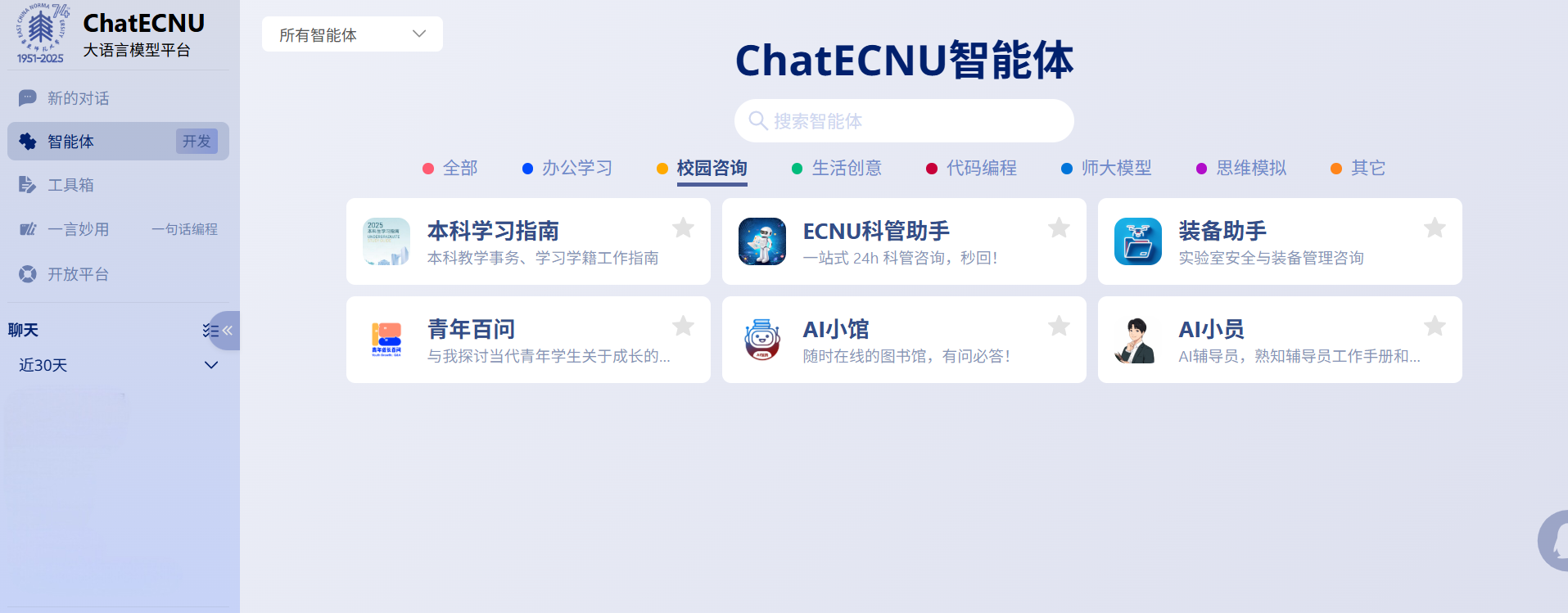 在agent平台发布的智能体,目前并不会进入【智能体中心】(此中心并未开放)。如果部门有对全校师生开放的需求,可联系信息办接入到chatECNU智能体中心,接入后并不会直接显示部门名称。效果类似于【本科生学习指南】。